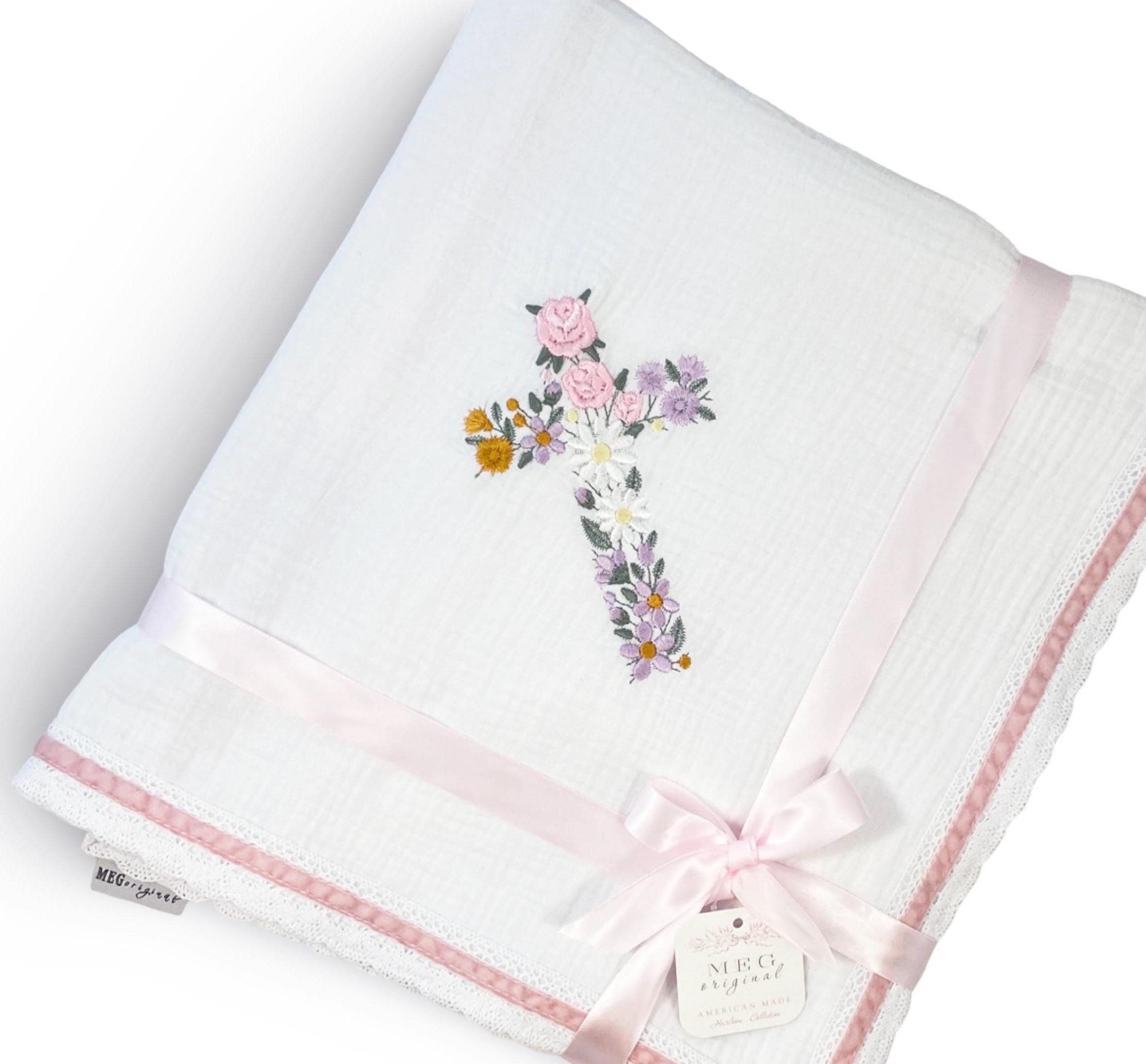 This beautiful baby blanket is made from dual thickness 100% cotton gauze and is embellished with delicate white crochet trim finishing. Lightweight, soft, and generously sized at 30 x 40 inches, this swaddle blanket makes a great gift for Baby Showers, Dedications, Baptisms, and Christenings.
