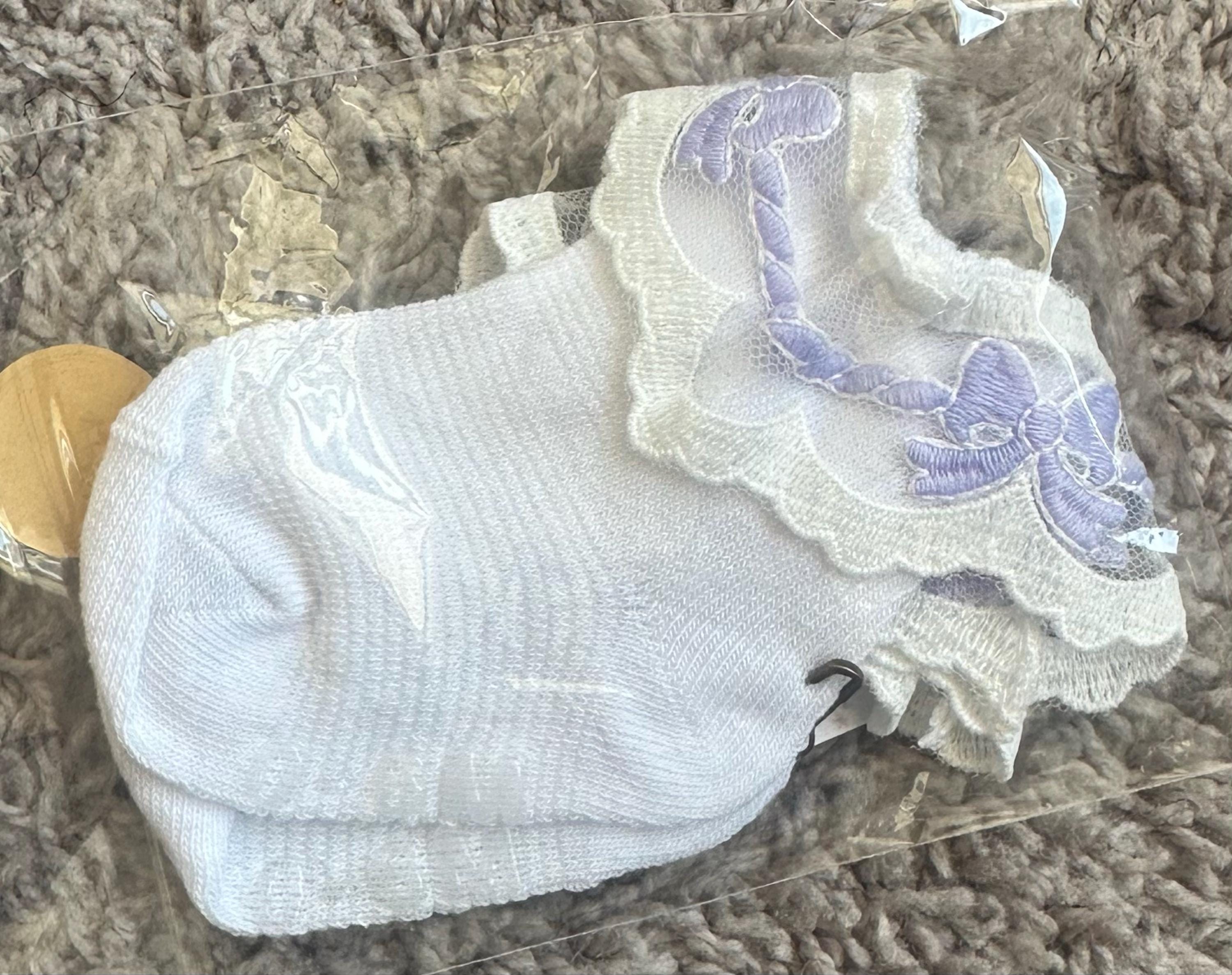 These sweet baby girl ruffle socks feature delicate lace trim in your choice of pink, Lavender, or blue bows.