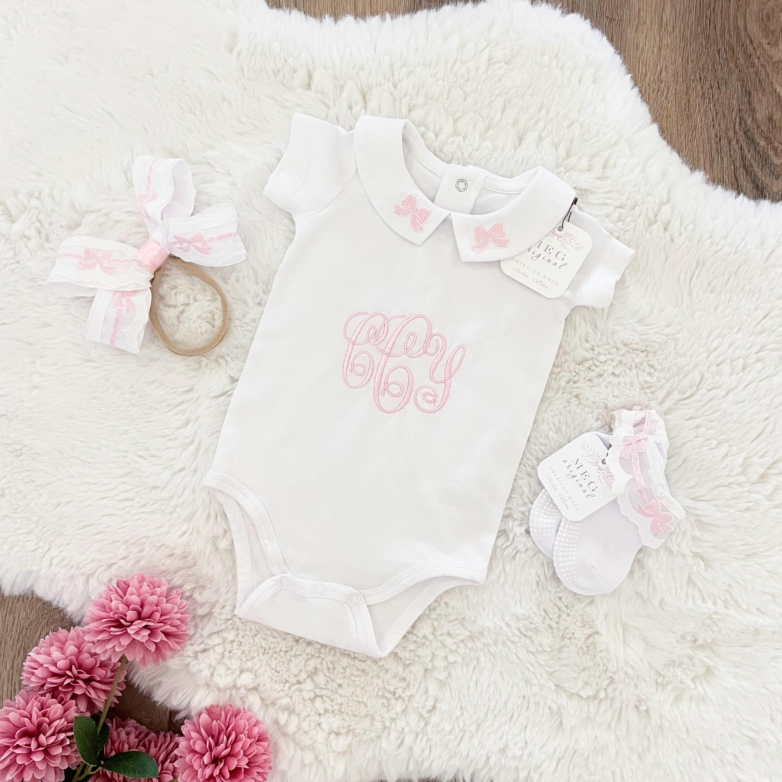 This sweet personalized newborn collared romper, hair bow, & ruffle sock set makes a wonderful baby shower gift.