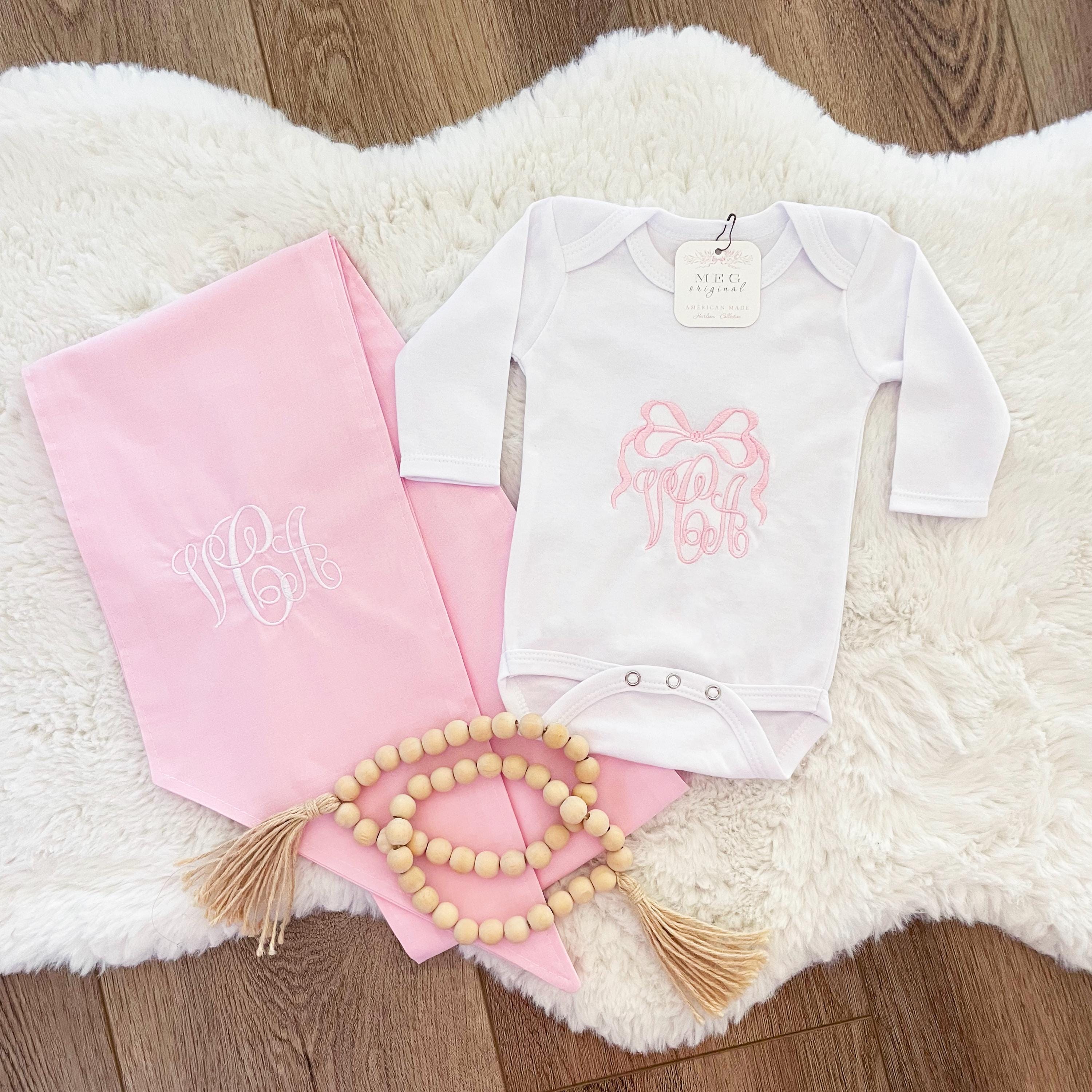 This beautiful Pink Newborn Swaddle Sash is personalized with baby's name or initials.