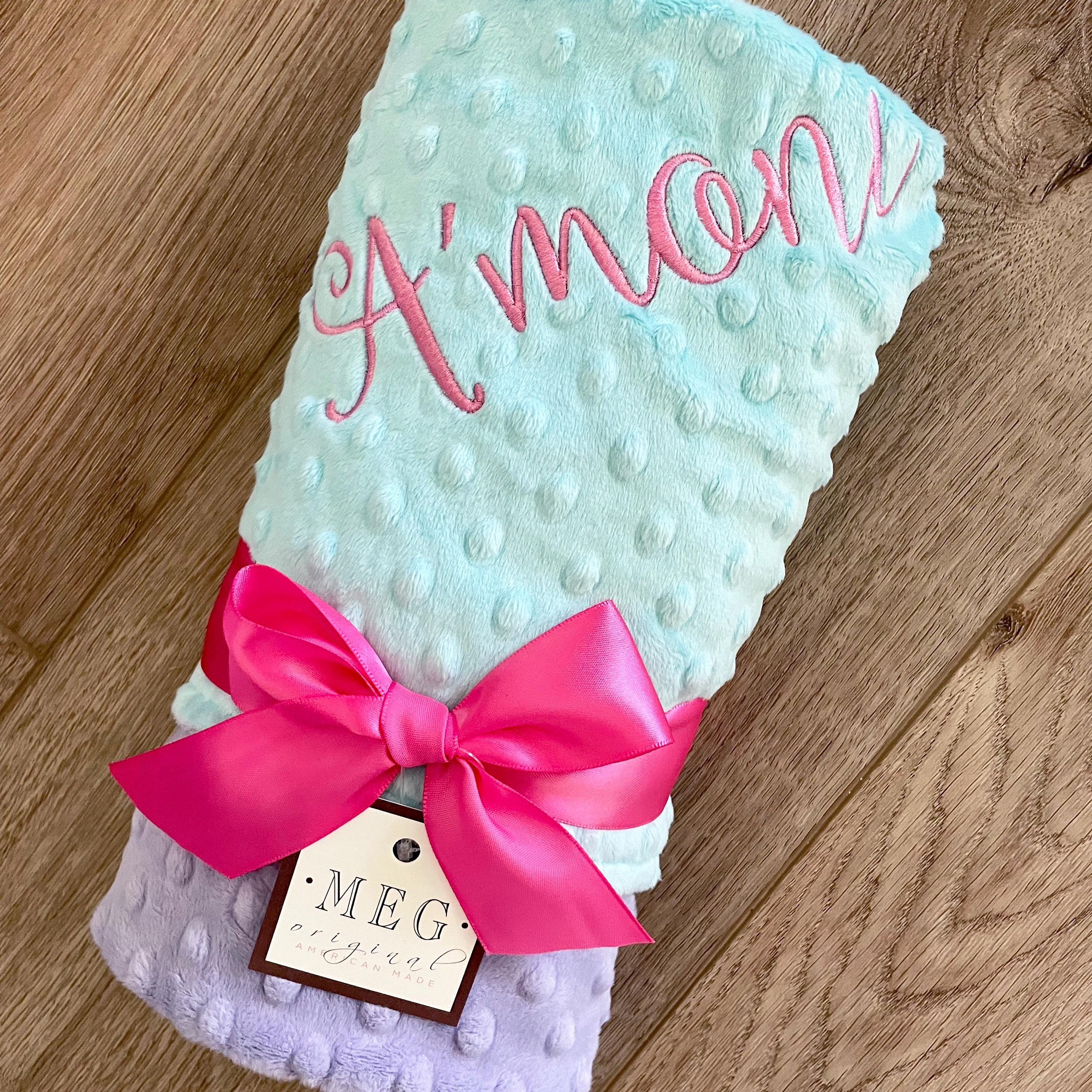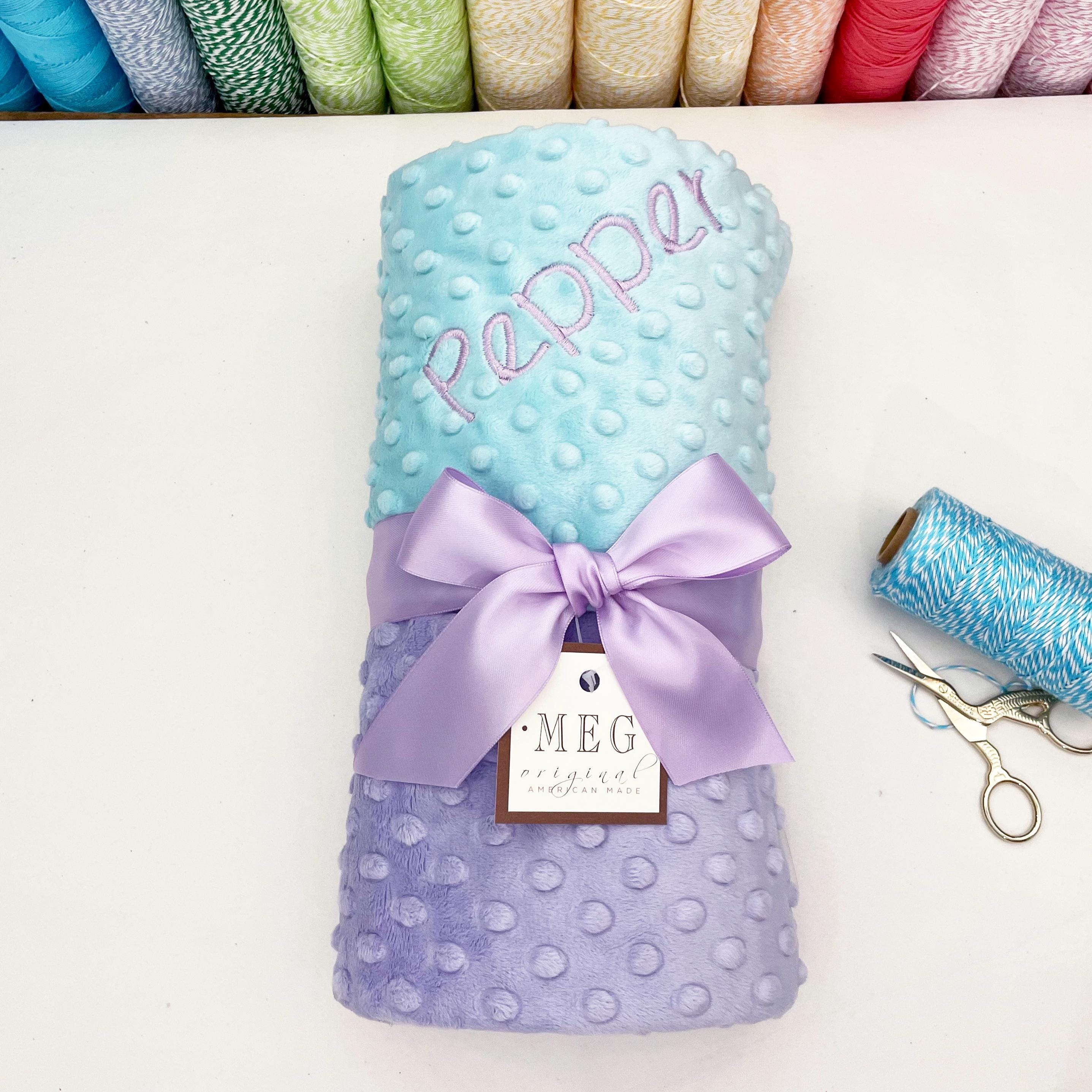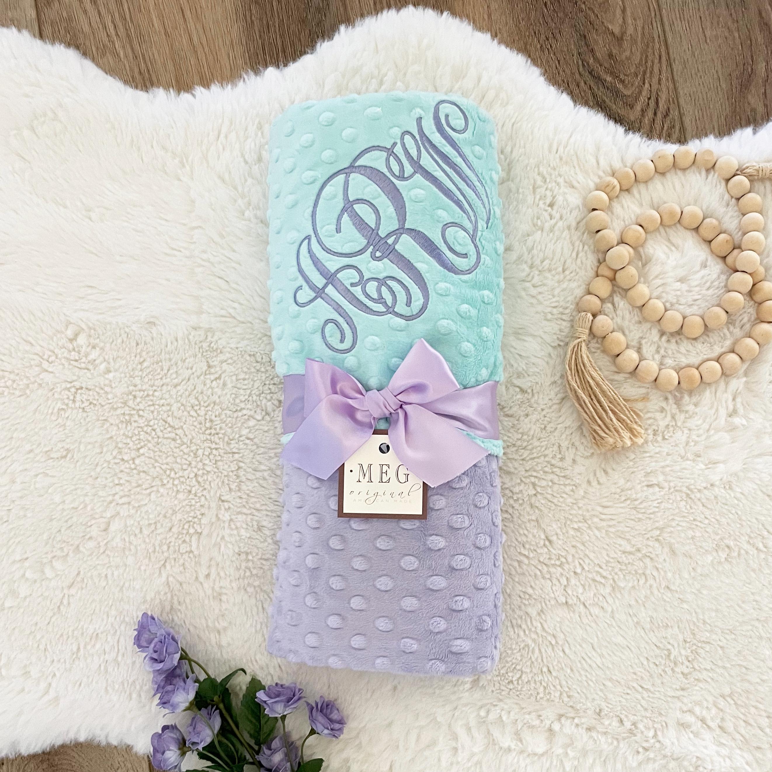This amazingly soft baby blanket is so pretty in reversible lavender & aqua. This adorable handmade blanket is not only beautiful, it wears and washes great for many years of use! We're happy to add a name or initials. Please see chart for thread color and font options.