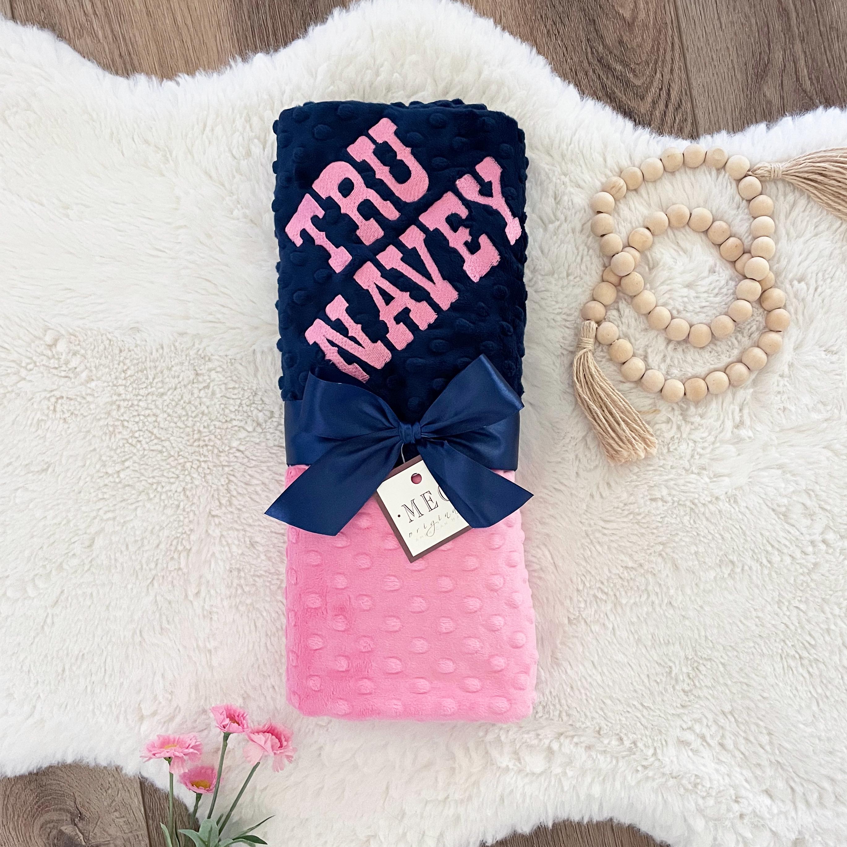 This beautiful reversible minky dot baby blanket is Paris Pink on one side & Navy Blue on the other.