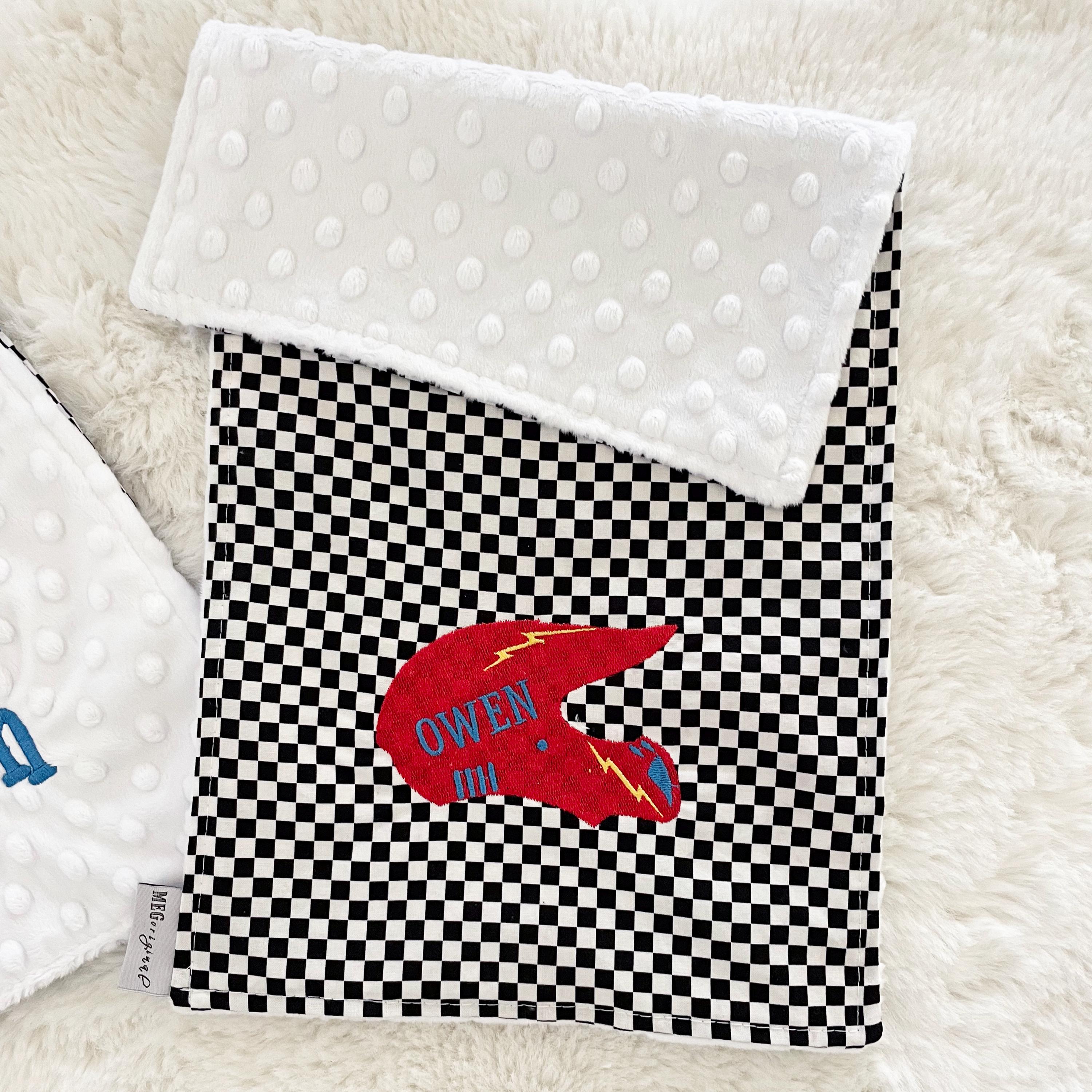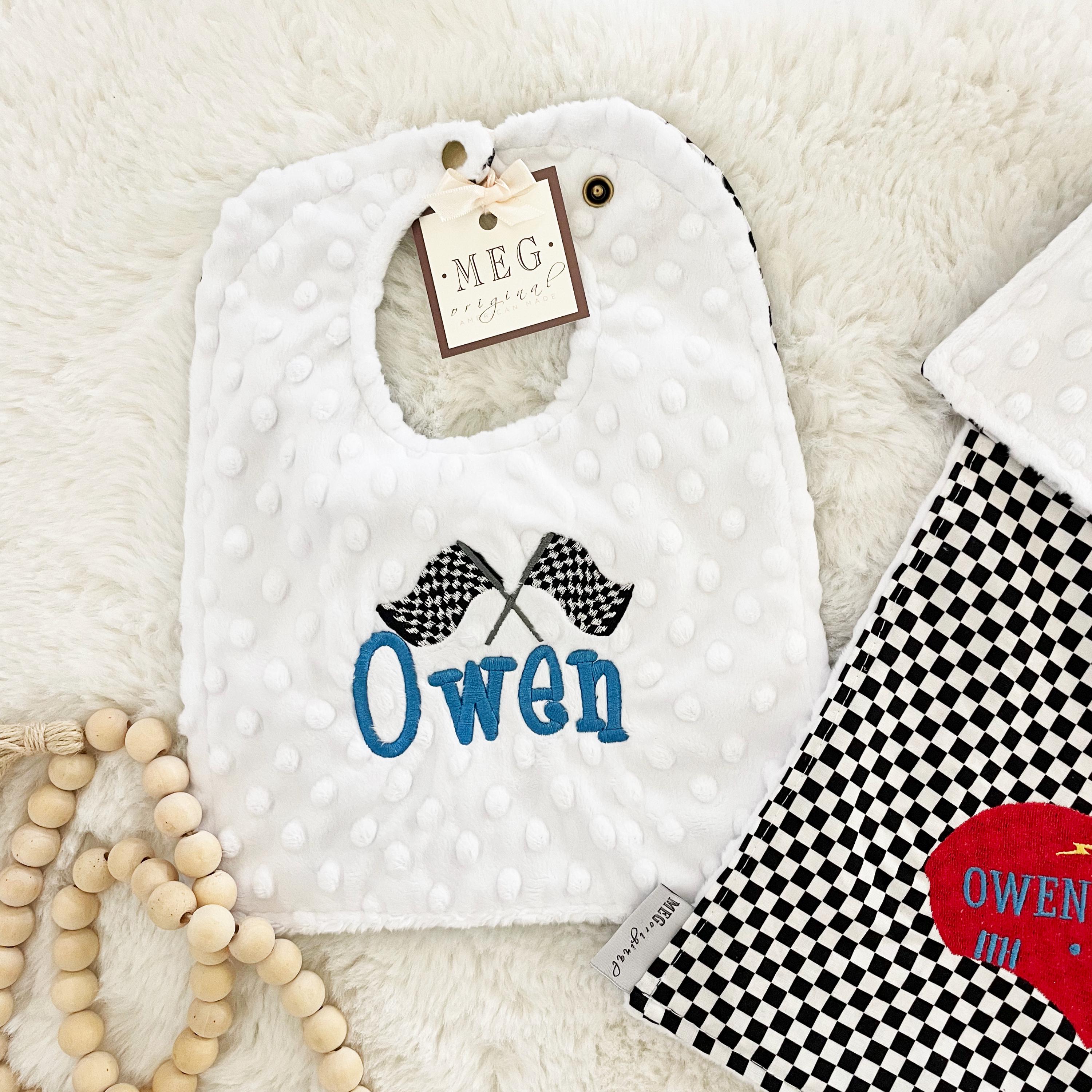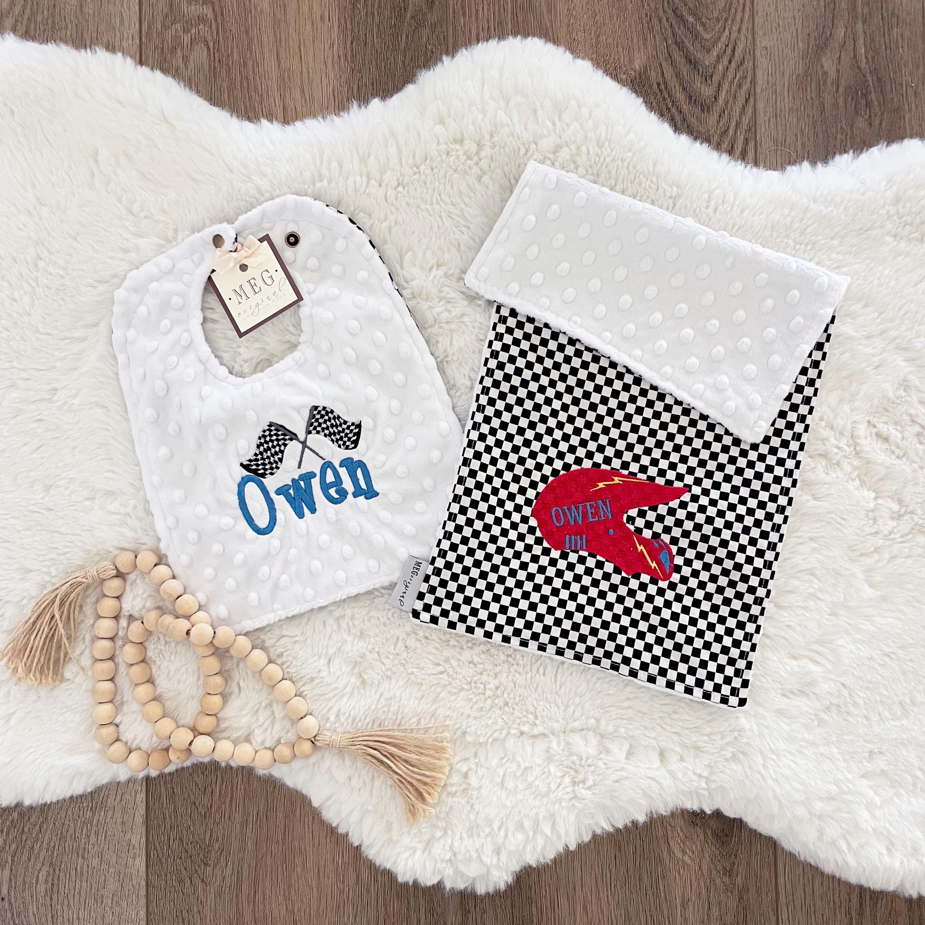 This fun Motocross Theme Baby-to-Toddler Adjustable Snap Bib & Burp Cloth Set is sure to be the hit of the Baby Shower!