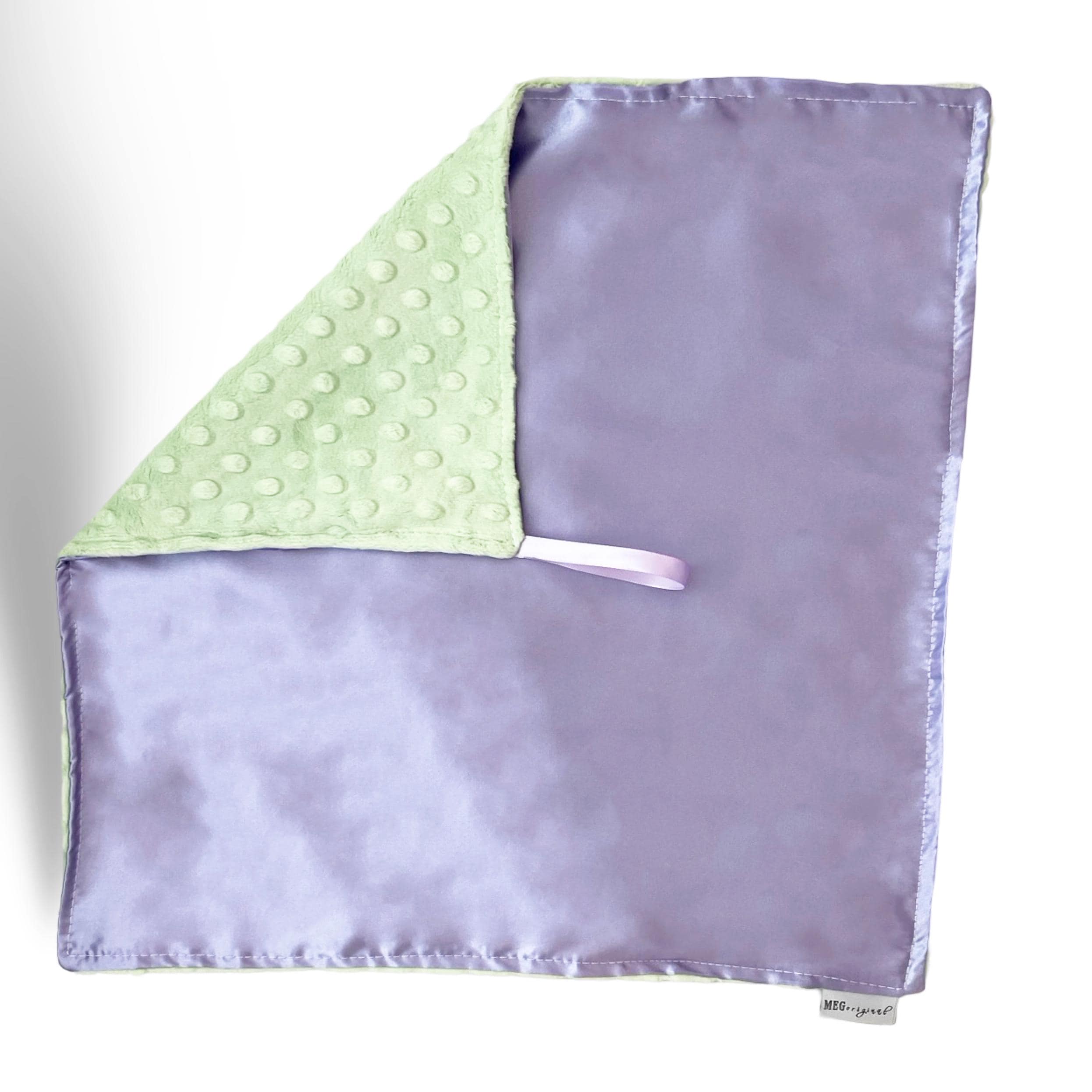 Every new baby's dream...silky satin on one side & minky dot on the other with a convenient loop for baby to hold (or thumb suckers to slide their thumb through).