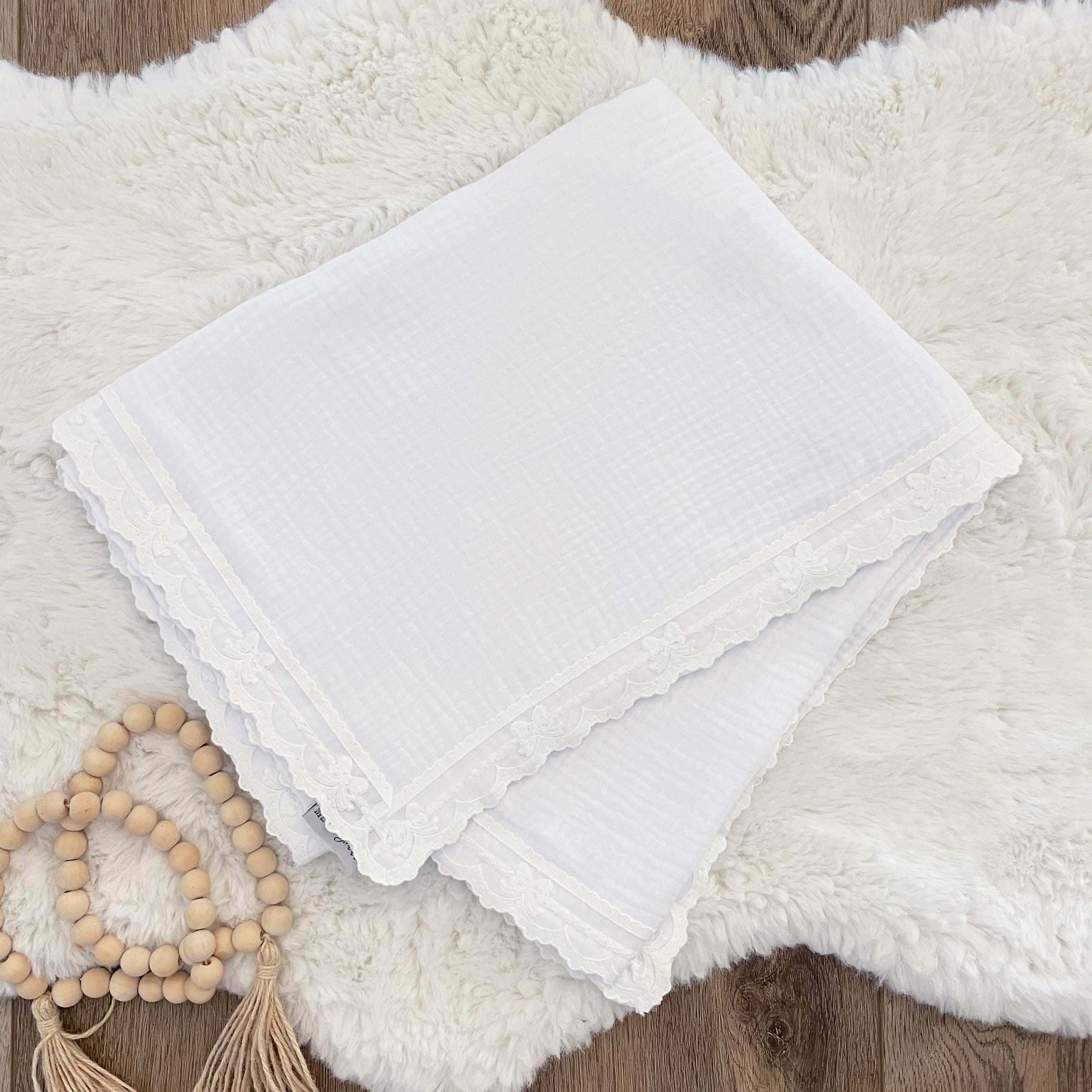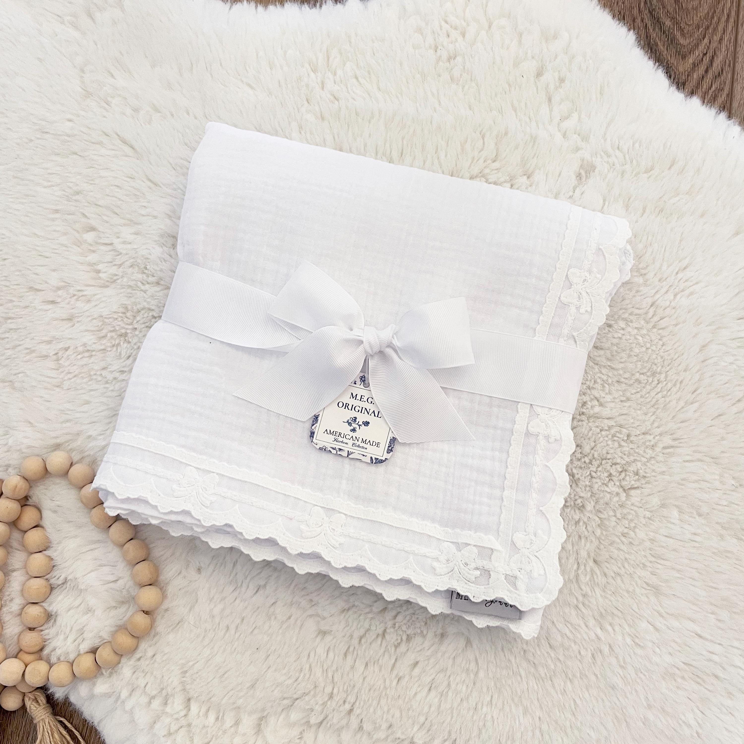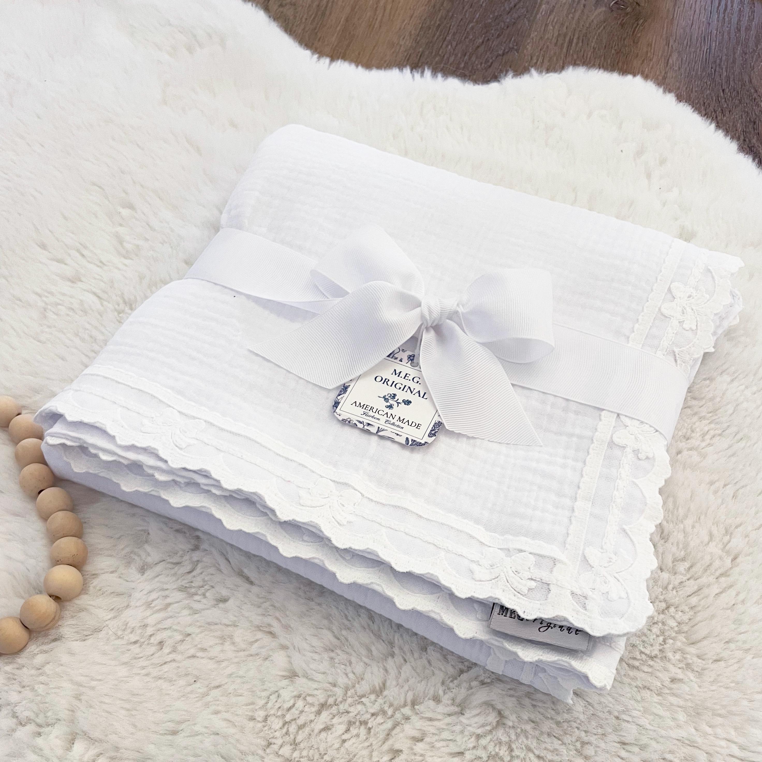 Blanket is dual thickness double gauze cotton with delicate bow trim finishing.