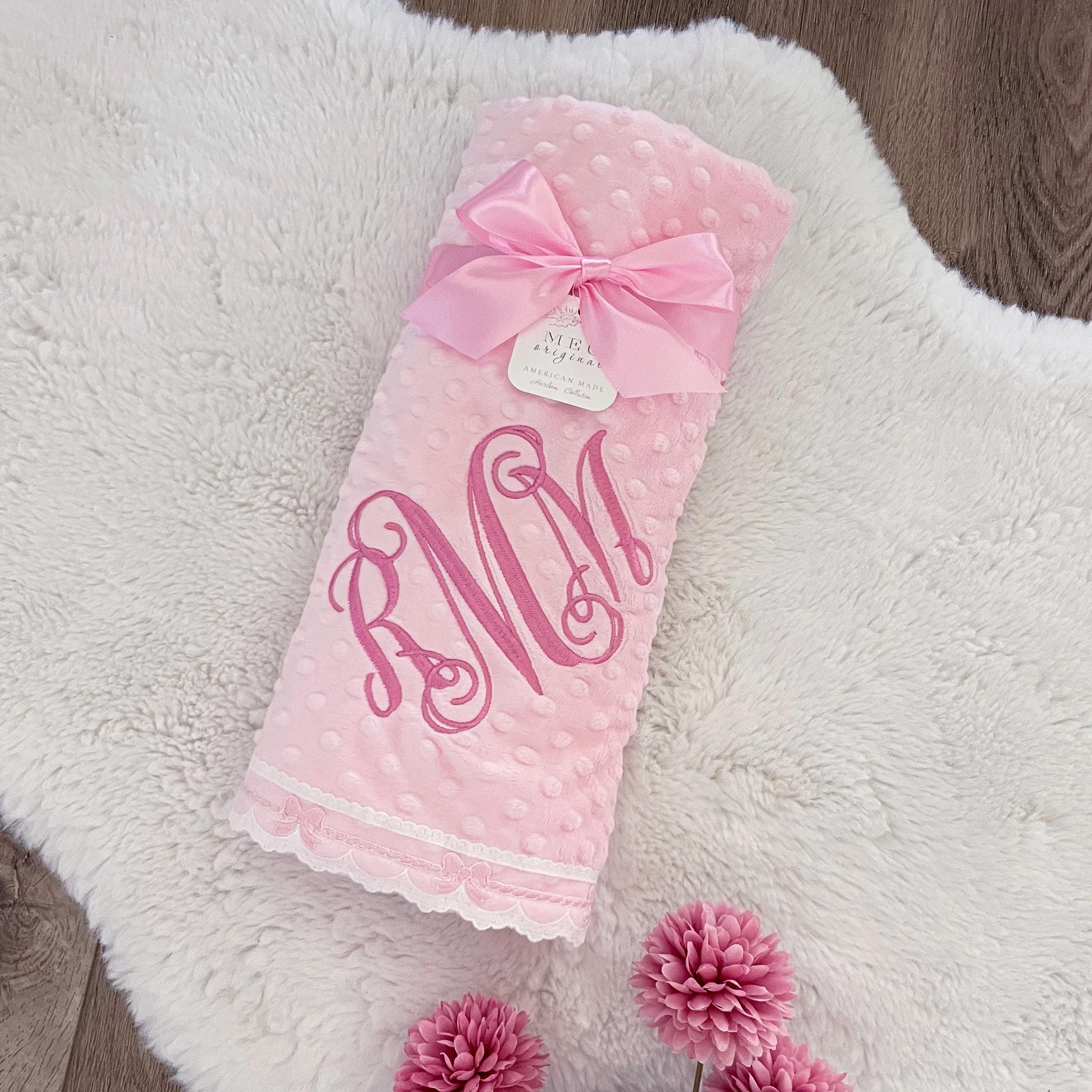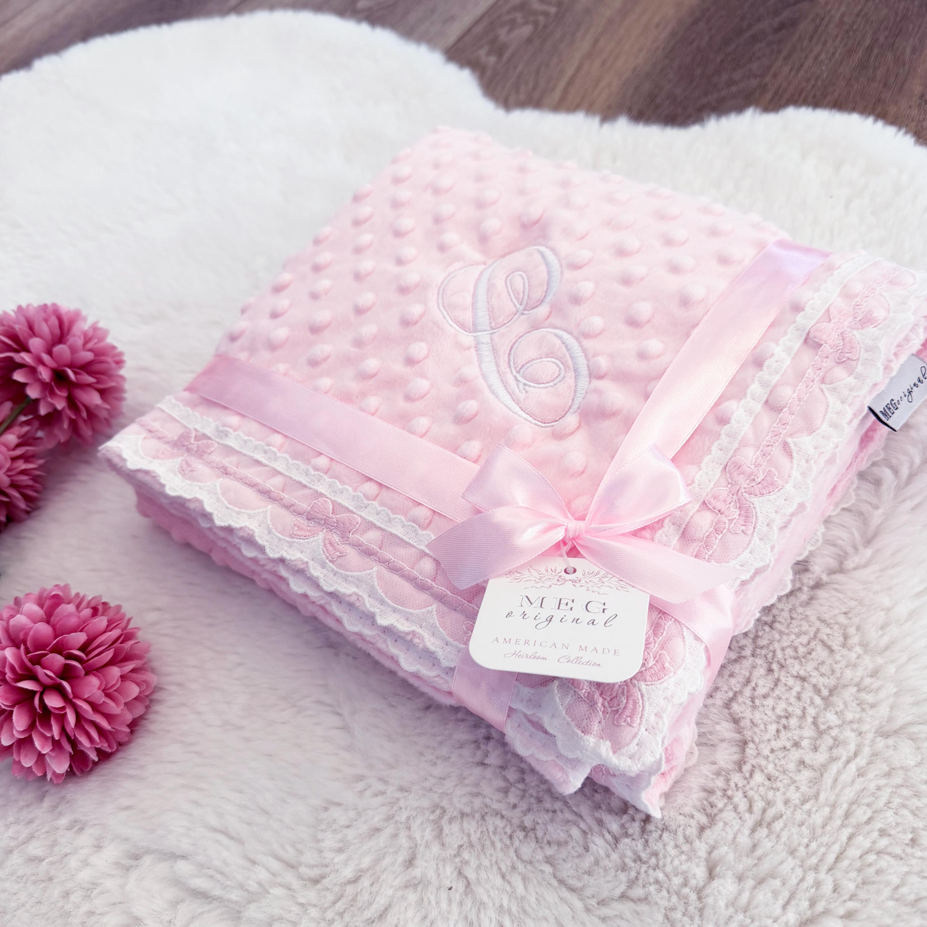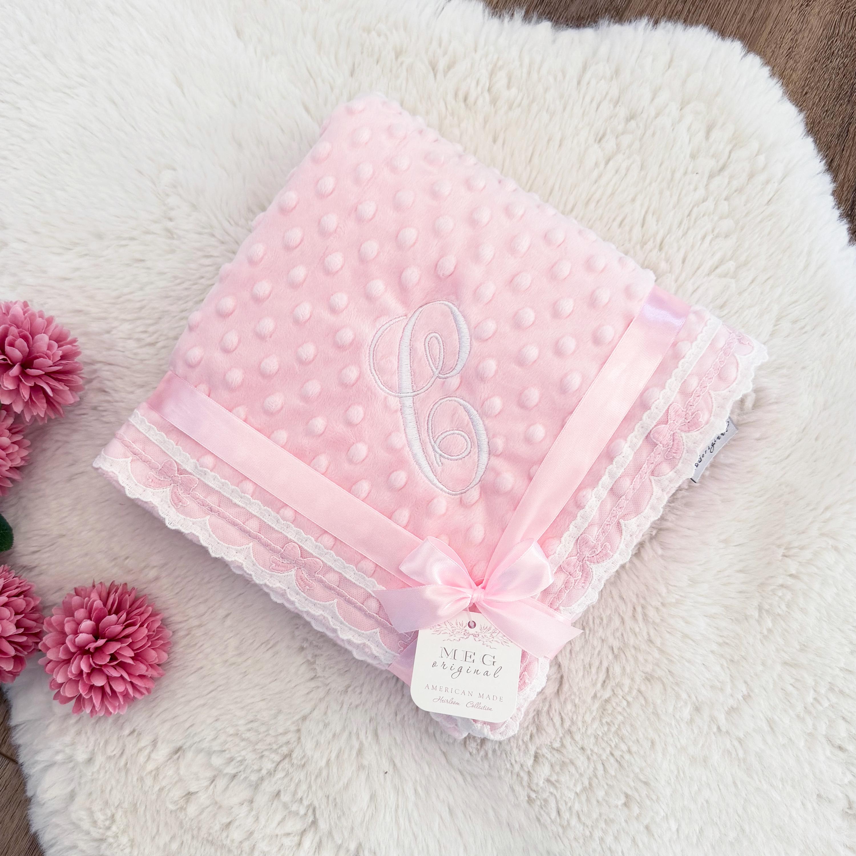 Blanket is dual thickness pink minky dot with delicate trim finishing.