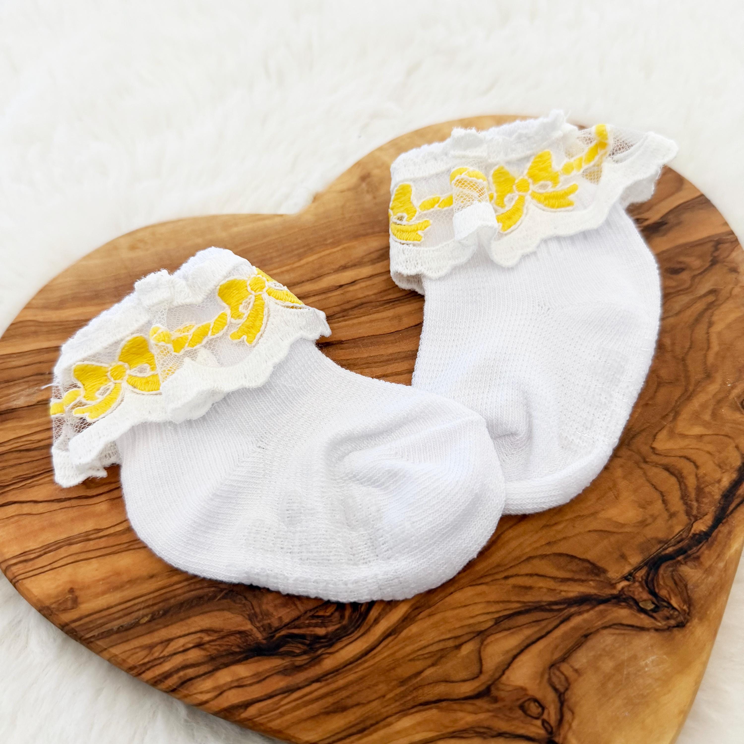 These sweet baby girl ruffle socks feature delicate bow lace trim in yellow.