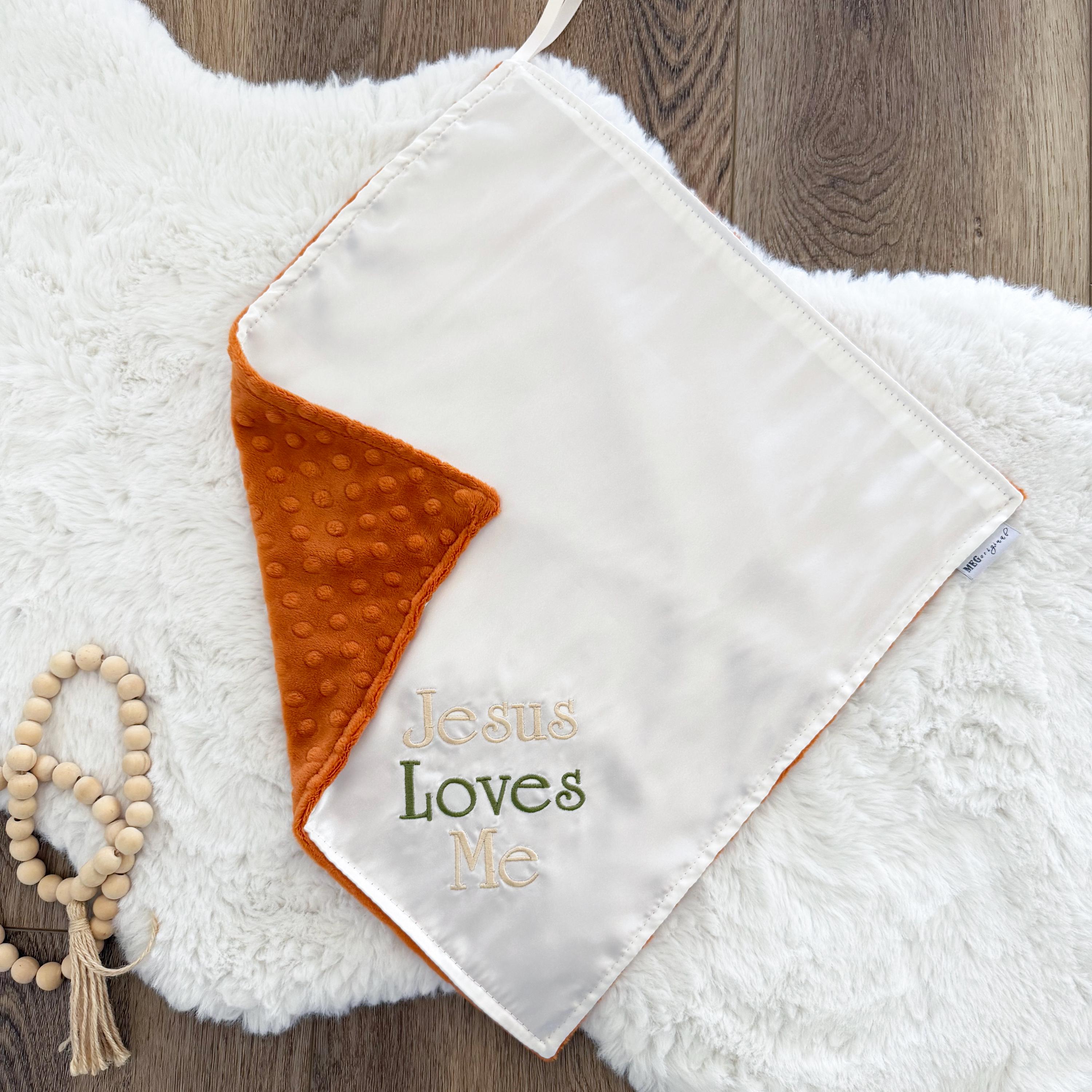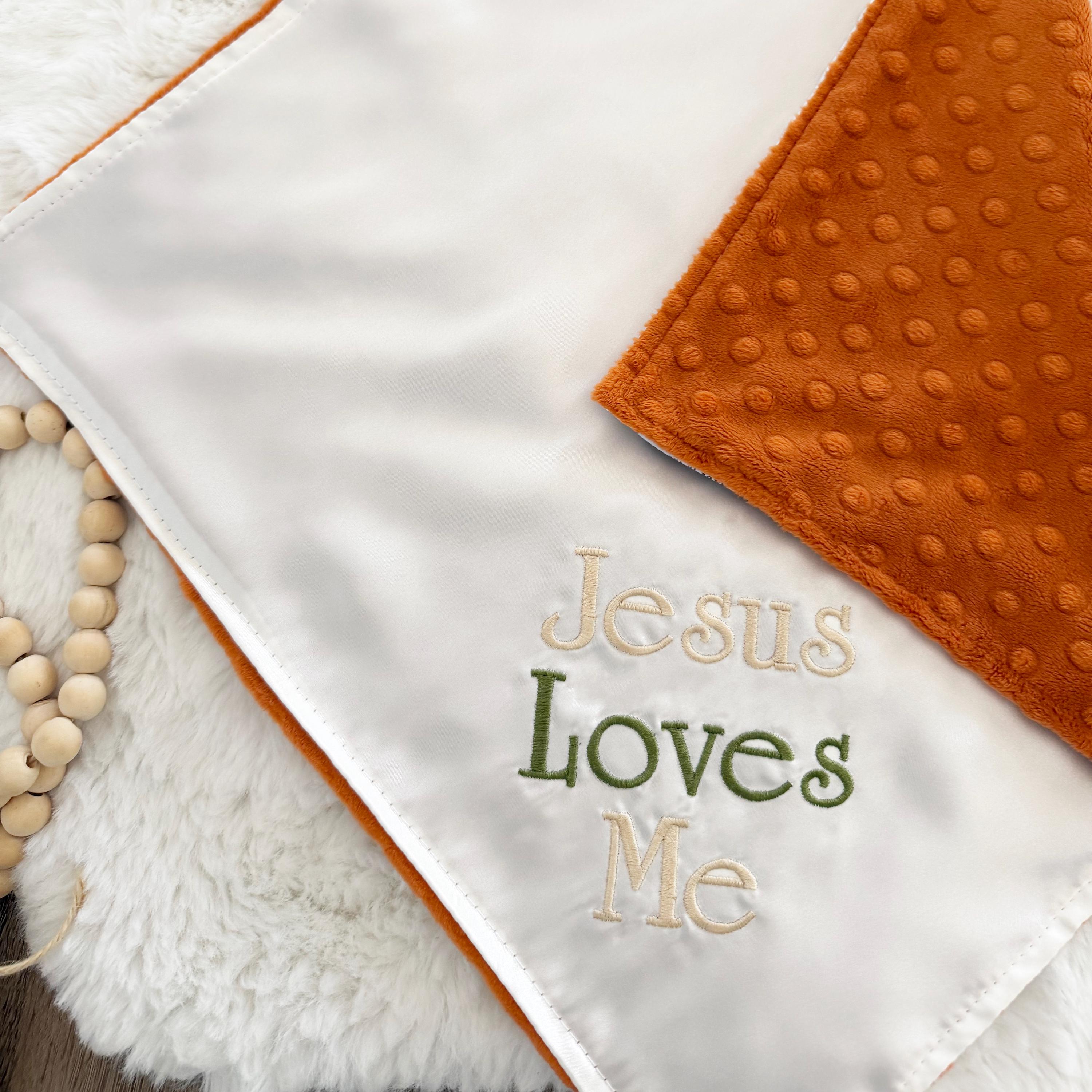 Every new baby's dream...silky satin on one side & minky dot on the other with the phrase "Jesus Loves Me" embroidered on the satin side.
