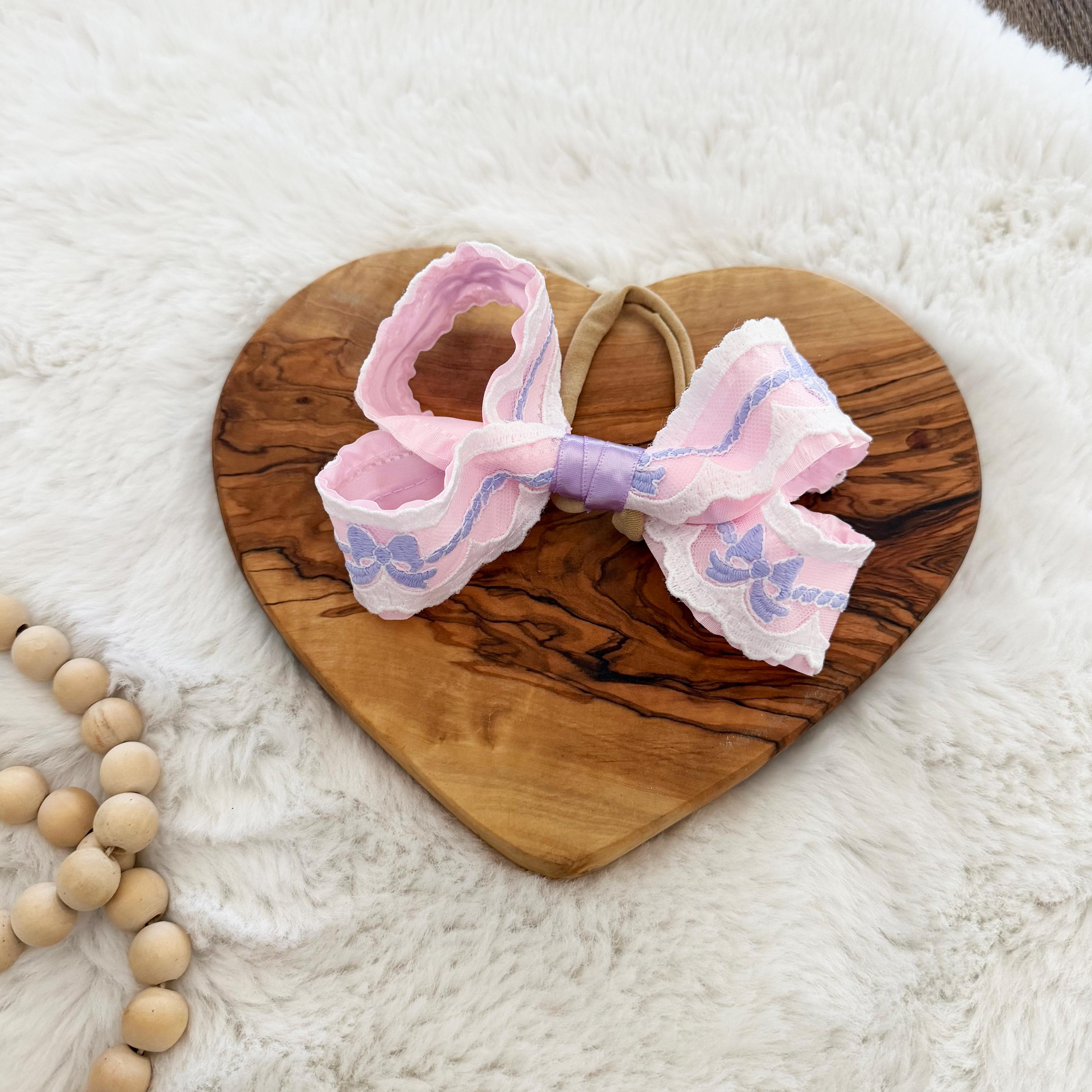 Shown in White with Pink & Purple thread, but also available in Oatmeal with Tan thread.
