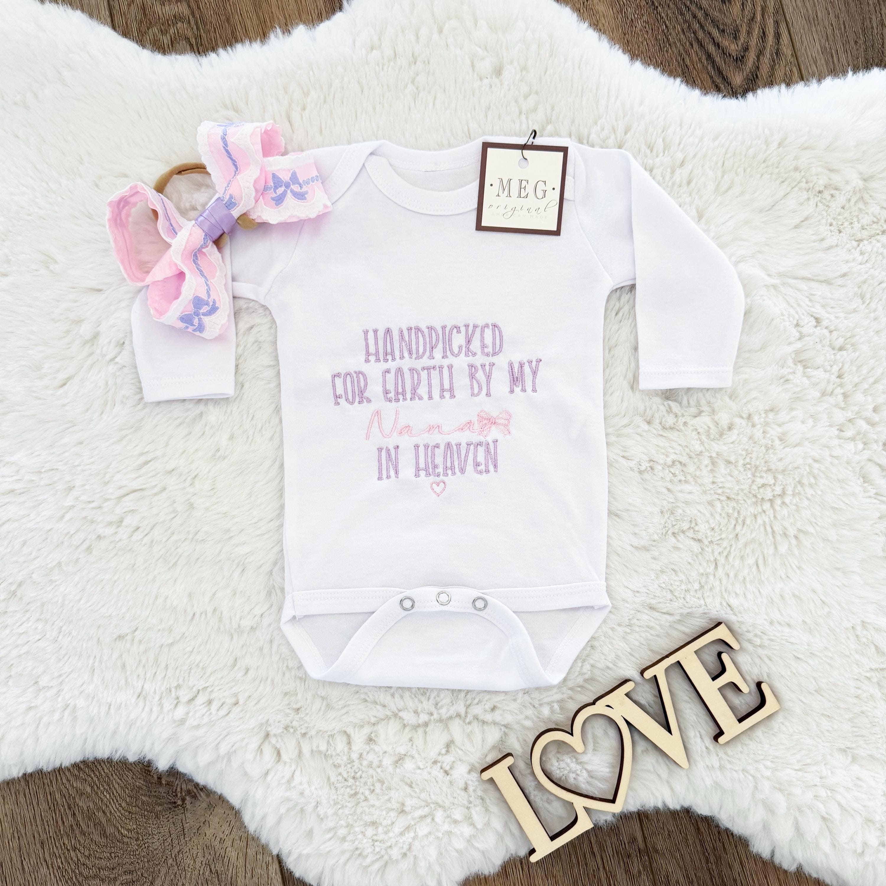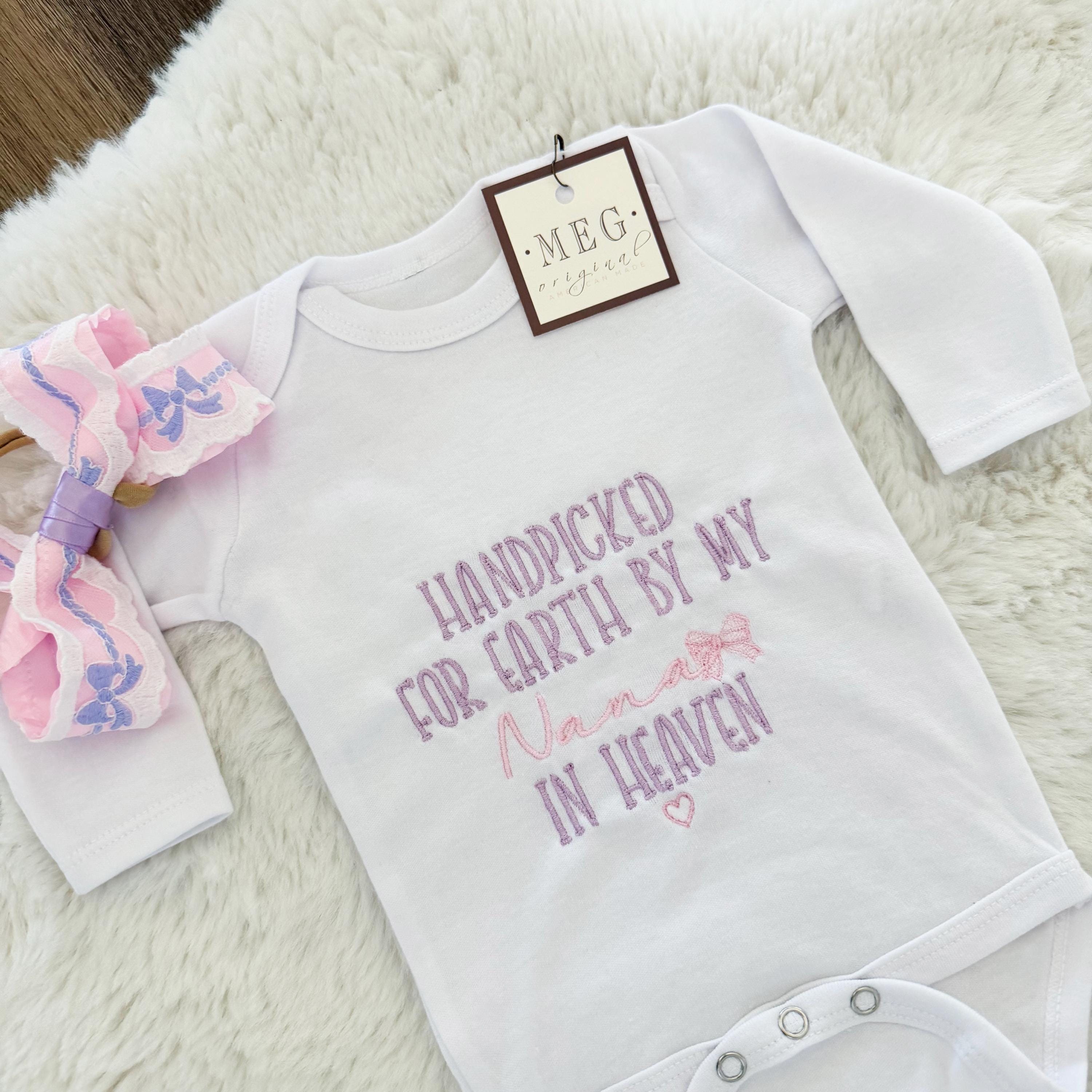 This sweet infant bodysuit & bow set tugs on the heart strings by paying homage to our special loved ones who are no longer with us.